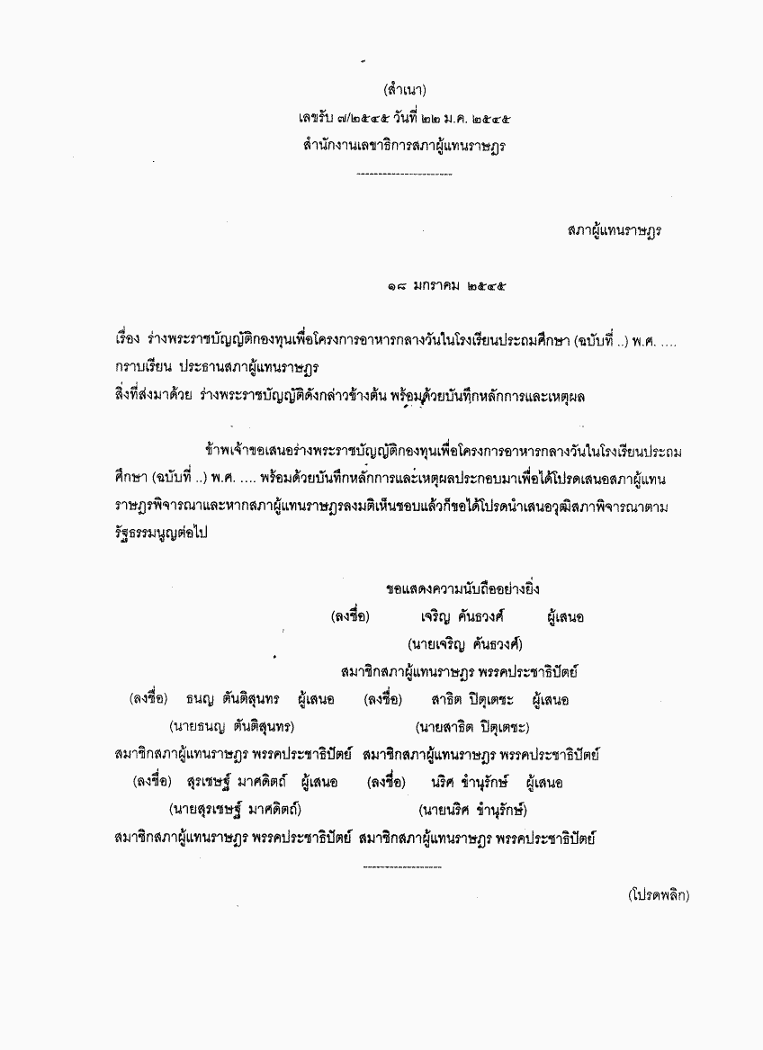 ร่างพระราชบัญญัติกองทุนเพื่อโครงการอาหารกลางวันในโรงเรียนประถมศึกษา (ฉบับที่ ..) พ.ศ. .... |