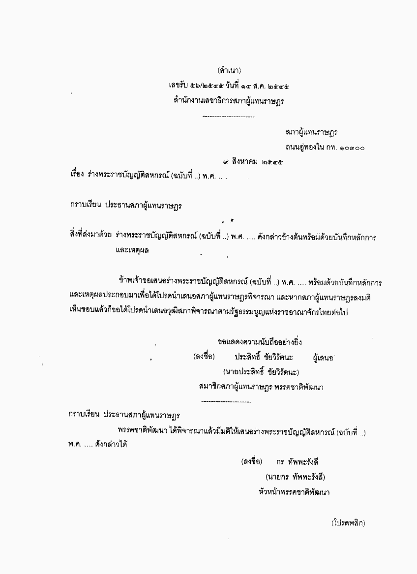 ชื่อเอกสาร :   ร่างพระราชบัญญัติสหกรณ์ (ฉบับที่ ..) พ.ศ. .... (นายประสิทธิ์ ชัยวิรัตนะ เป็นผู้เสนอ)
