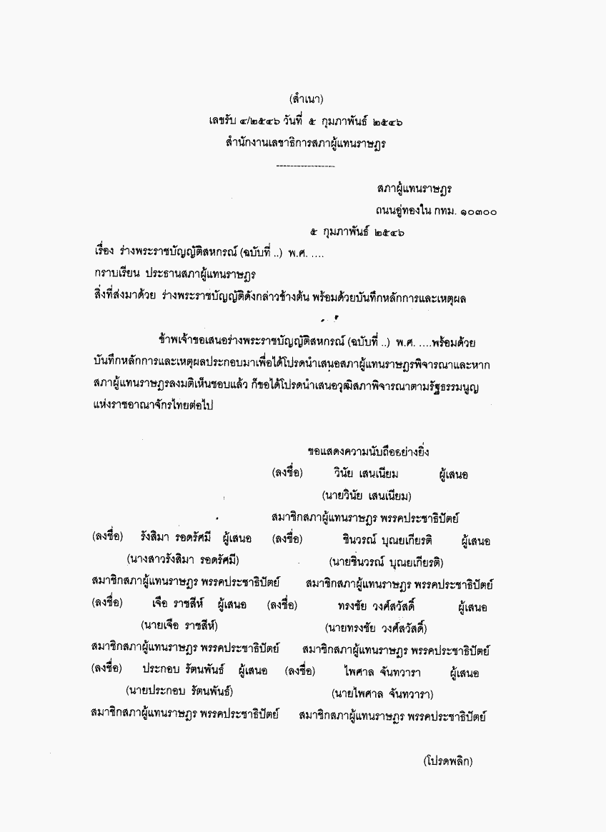 ชื่อเอกสาร :   ร่างพระราชบัญญัติสหกรณ์ (ฉบับที่ ..) พ.ศ. .... (นายวินัย เสนเนียม กับคณะ เป็นผู้เสนอ) (ค้างมาจากที่ประชุมสภาผู้แทนราษฎร ชุดที่ 21 ปีที่ 3 ครั้งที่ 3 (สมัญสามัญทั่วไป) วันพุธที่ 12 กุมภาพันธ์ 2546)