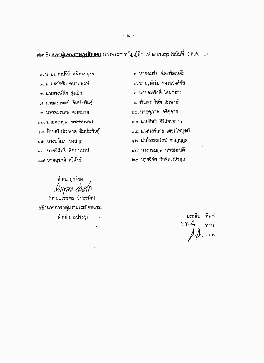 • ร่างพระราชบัญญัติการสาธารณสุข (ฉบับที่ ..) พ.ศ. .... (นายประสิทธิ์ ชัยวิรัตนะ และนายสำเร็จ อัจฉริยะประสิทธ์ เป็นผู้เสนอ)