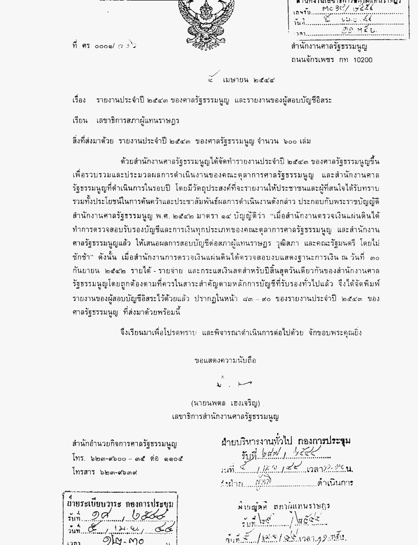 รับทราบรายงานประจำปี ๒๕๔๓ ของศาลรัฐธรรมนูญ และรายงานของผู้สอบบัญชีอิสระ |