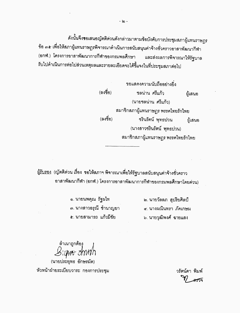 ขอเสนอญัตติด่วน เรื่อง ขอให้สภาฯ พิจารณาเพื่อให้รัฐบาลสนับสนุนค่าจ้างชั่วคราวอาสาพัฒนากีฬา (อกฬ.) โครงการอาสาพัฒนาการกีฬาของกรมพลศึกษาโดยด่วน |