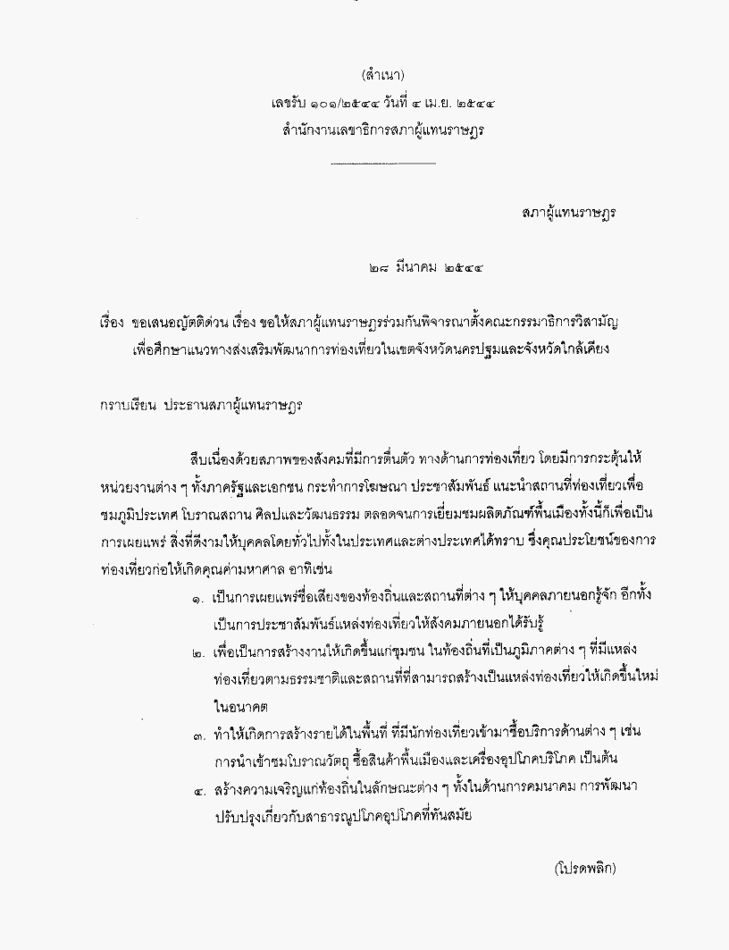 ขอเสนอญัตติด่วน เรื่อง ขอให้สภาผู้แทนราษฏรร่วมกันพิจารณาตั้งคณะกรรมาธิการวิสามัญเพื่อศึกษาแนวทางส่งเสริมพัฒนาการท่องเที่ยวในเขตจังหวัดนครปฐมและจังหวัดใกล้เคียง |